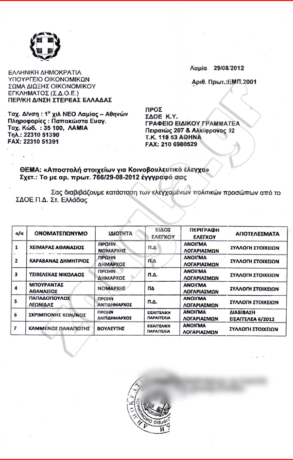 Το ένα από τα έγγραφα είναι αυτό, που βλέπετε στη φωτογραφία και προέρχεται από το ΣΔΟΕ Περιφέρειας Στερεάς Ελλάδας. Όπως προκύπτει από το έγγραφο οι δύο πολιτικοί ελέγχονται με την ιδιότητα του Νομάρχη, που κατείχαν ο μεν κ. Μπουραντάς στην Εύβοια, ο δε κ. Χειμάρας στη Φθιώτιδα.