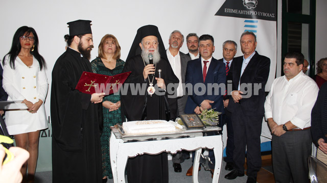 Την πίτα ευλόγησε ο Μητροπολίτης Χαλκίδας κ. Χρυσόστομος και έκοψαν μαζί η πρόεδρος του Επιμελητηρίου Βούλα Αγιοστρατίτη, ο πρόεδρος της Ομοσπονδίας Επαγγελματοβιοτεχνών Ηλίας Θαλάσσης και ο πρόεδρος της Ομοσπονδίας Εμπορικών Συλλόγων Εύβοιας Σπύρος Γεροντίτης.