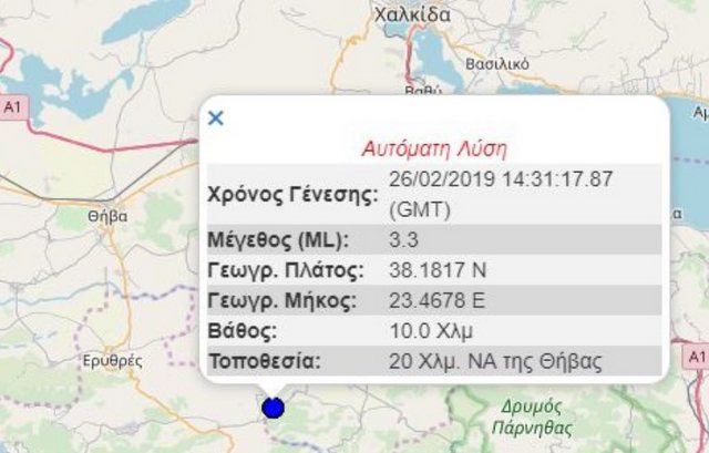 Σεισμική δόνηση 3,3 βαθμών της κλίμακας Ρίχτερ σημειώθηκε λίγο μετά τις 4:30 το απόγευμα της Τρίτης 26 Φεβρουαρίου, 20 χιλιόμετρα νοτιανατολικά της Θήβας, σύμφωνα με την αυτόματη λύση του Γεωδυναμικού Ινστιτούτου.