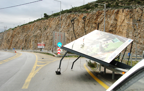 Πολλές από αυτές τις πινακίδες έχουν μπει άναρχα και χωρίς καμία αδειοδότηση. Αλλες έχουν προξενήσει σοβαρό κίνδυνο στην οδική ασφάλεια, όπως για παράδειγμα συνέβη πριν από λίγο καιρό στην Υψηλή Γέφυρα, όπου έπεσε ένα τεράστιο διαφημιστικό πάνελ εξαιτίας του αέρα και από θαύμα δεν θρηνήσαμε θύματα (φωτό).