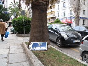 Άντε τώρα κανένας αφελής να ακολουθήσει το βέλος, που λέει PARKING και να παρκάρει. Δεμένο θα τον πάνε! Βλέπετε εκεί που δείχνει το βέλος είναι το φαρδύ πεζοδρόμιο μπροστά στα δικαστήρια.