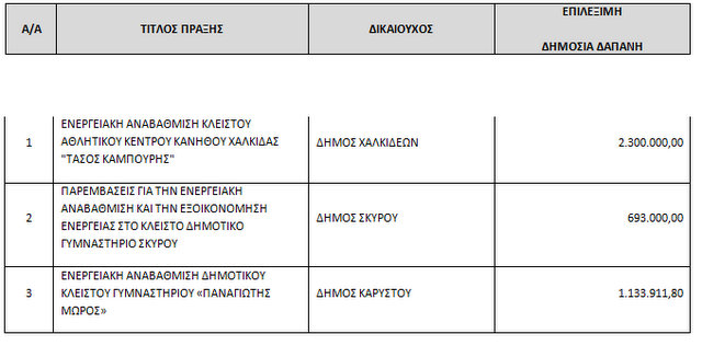 Οι χρηματοδοτήσεις αυτές εντάσσονται στο πλαίσιο της πρόσκλησης «Ενεργειακή αναβάθμιση Δημοσίων Κτιρίων - Δράσεις Ενεργειακής Αναβάθμισης και Εξοικονόμησης Ενέργειας (ΕΞΕ) και Αξιοποίησης Ανανεώσιμων Πηγών Ενέργειας (ΑΠΕ) σε Αθλητικές Εγκαταστάσεις» του Επιχειρησιακού Προγράμματος «Υποδομές Μεταφορών, Περιβάλλον και Αειφόρος Ανάπτυξη» του Υπουργείου Οικονομίας και Ανάπτυξης.