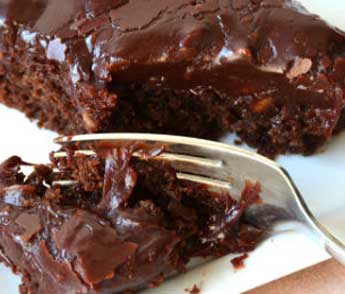 Παράλληλα, σε ένα κατσαρολάκι βάζουμε τα υλικά για το σιρόπι (μιάμιση κούπα νερό και μιάμιση κούπα ζάχαρη) και τα βράζουμε για 8 λεπτά. Ανακατεύουμε να λιώσει η ζάχαρη. Μόλις γίνει το σιρόπι μας, περιχύνουμε με αυτό τη ζεστή σοκολατόπιτα. Ετσι όπως είναι ζεστό το κέικ, θα σιροπιάσει καλά. Θα δείτε ότι θα ρουφήξει όλο το σιρόπι.