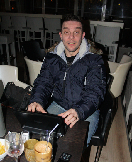 Ο Στράτος Καραμουρτζούνης έπινε αμέριμνος το καφεδάκι του στο Πέτρινο παρέα με τον υπολογιστή του όταν τον πλησιάσαμε και τον ρωτήσαμε πού σερφάρει.