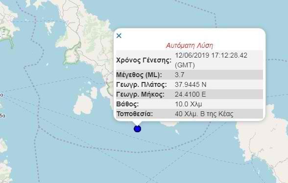 Σεισμική δόνηση μεγέθους 3,7 βαθμών της κλίμακας Ρίχτερ σημειώθηκε στις 8:12 το βράδυ της Τετάρτης 12 Ιουνίου, ανοιχτά της Καρύστου, στη νότια Εύβοια. Ο σεισμός έγινε αισθητός στην ευρύτερη περιοχή.