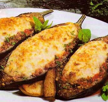 Λιώνετε τη σάρκα στις μελιτζάνες με ένα πιρούνι, τις γεμίζετε με το κρέας πρώτα και μετά απλώνετε την κρέμα γιαουρτιού. Πασπαλίζετε με τη υπόλοιπη γραβιέρα και ψήνετε σε προθερμασμένο φούρνο στους 180οC, μέχρι να πάρουν χρώμα.