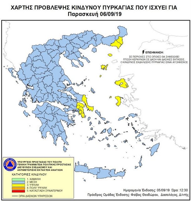 Σύμφωνα με τον Χάρτη Πρόβλεψης Κινδύνου Πυρκαγιάς, που ισχύει για την Παρασκευή 6 Σεπτεμβρίου, είναι υψηλός ο Κίνδυνος Πυρκαγιάς σε Αττική, Νότια Εύβοια, Έβρο, Σαμοθράκη, Λήμνο, Λέσβο και Χίο.