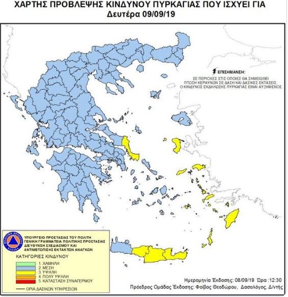 Σύμφωνα με τον χάρτη, οι περιοχές που διατρέχουν υψηλό κίνδυνο είναι η Νότια Εύβοια, η Χίος, η Σάμος, η Ικαρία, τα Δωδεκάνησα και η Κρήτη.