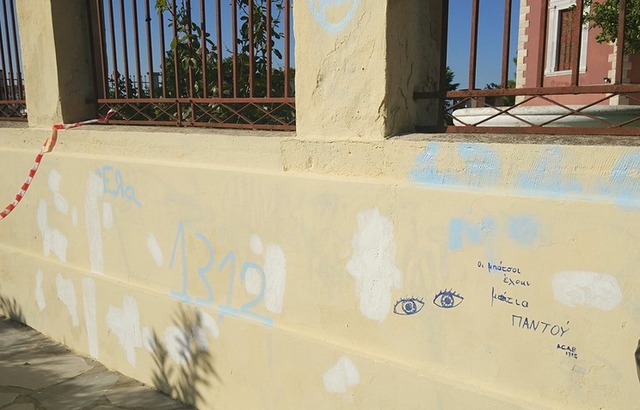 Πριν στεγνώσει η μπογιά του ελαιοχρωματισμού, το βράδυ της Παρασκευής 11 Οκτωβρίου, ο άγνωστος γκραφιτάς χτύπησε πάλι και γέμισε συνθήματα και σχεδιάκια τον τοίχο.