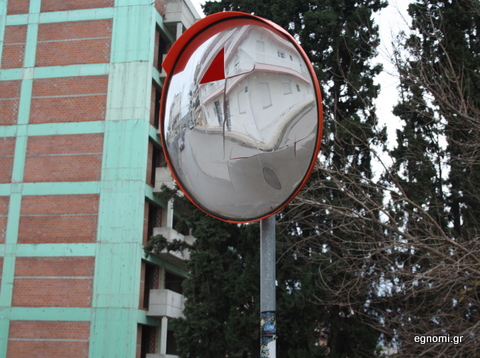 Ο καθρέπτης της φωτογραφίας βρίσκεται στην οδό Μονής Ερίων και δεν ο μοναδικός καθρέπτης ελέγχου της κίνησης, που έχει σπάσει στην πόλη. Για τους προληπτικούς ο σπασμένος καθρέπτης σημαίνει επτά χρόνια γρουσουζιάς.