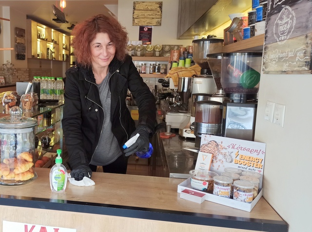 Με μάσκα στο πρόσωπο και γάντια στα χέρια, απολυμαίνει συνέχεια τον πάγκο στο μαγαζί της, για την δική της ασφάλεια και των πελατών της. Μίλησε στο egnomi.gr για το μεροκάματο της αγωνίας, που παίρνει αυτές τις μέρες.