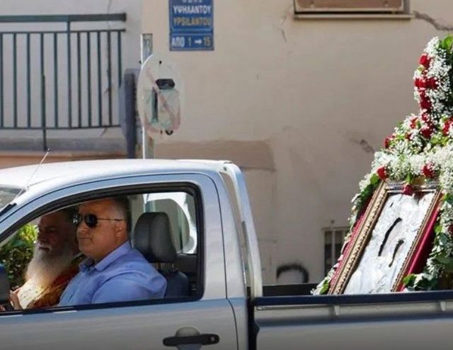 H περιφορά στους κεντρικούς δρόμους της πόλης έγινε με αγροτικό αυτοκίνητο, στο οποίο επέβαινε και ο τοπικός μητροπολίτης Ιερώνυμος.