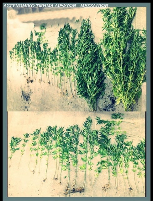 - 35 δενδρύλλια κάνναβης, σε ανάπτυξη, ύψους έως και 1,90 μέτρων, τα οποία ήταν φυτεμένα στον αύλιο χώρο του σπιτιού και επιμελώς κρυμμένα μέσα σε αγκαθωτά φυτά (βάτα).