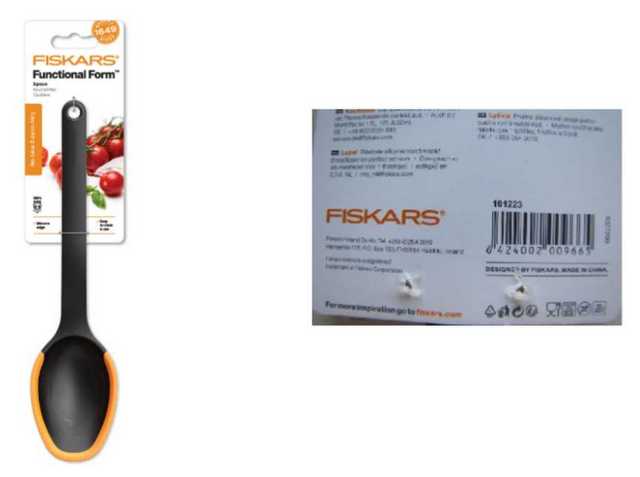 Πρόκειται για πλαστική κουτάλα μαύρου χρώματος, με εμπορική ονομασία "FISKARS", προέλευσης Κίνας, με κωδικό προϊόντος 1027299 και αριθμό παρτίδας 191223.