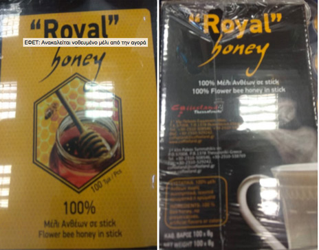 Πρόκειται για 100% μέλι ανθέων σε stick - συσκευασία των 800 γραμμαρίων (100 τεμάχια των 8 γραμμαρίων έκαστο) με την εμπορική ονομασία «Royal honey» σε χάρτινη κλειστή συσκευασία 800 γρ, με αριθμό παρτίδας L06022020 και ανάλωση κατά προτίμηση πριν από: 06/01/2022.