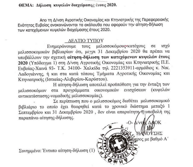 Από την Διεύθυνση Αγροτικής Οικονομίας και Κτηνιατρικής της Περιφερειακής Ενότητας Εύβοιας ανακοινώθηκε ότι οι μελισσοκόμοι του νομού πρέπει να δηλώσουν τις κατεχόμενες κυψέλες έτους 2020.