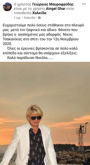 Οι έρευνες της Αστυνομίας για την ανεύρεση των δολοφόνων του εμπόρου ρούχων Νίκου Τσακανίκα συνεχίζονται και -σύμφωνα με ανάρτηση που έκανε στο facebook ο Γιώργος Μαυροφρύδης, σύζυγος της αδελφής του εκλιπόντος Ειρήνης Τσακανίκα, βρίσκονται σε καλό δρόμο.