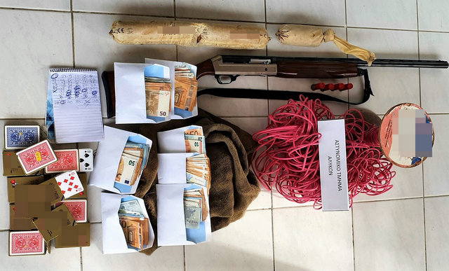 Κατά τον έλεγχο στο χώρο βρέθηκαν συνολικά και κατασχέθηκαν το χρηματικό ποσό των 3.225 ευρώ, 12 τράπουλες, 3 μασούρια αμμωνιοδυναμίτιδας και 105 μέτρα φυτίλι, ενώ σε όχημα ενός εκ των συλληφθέντων βρέθηκε και κατασχέθηκε κυνηγετική καραμπίνα με 4 φυσίγγια.