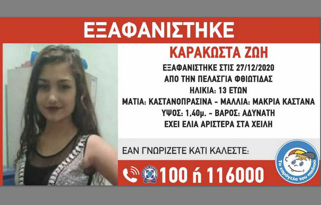 Από την Κυριακή 27 Δεκεμβρίου έχει εξαφανιστεί η 13χρονη Ζωή Καράκωστα, από το σπίτι της, στην Πελασγία Φθιώτιδας. Από το Χαμόγελο του Παιδιού εκδόθηκε ανακοίνωση, για την εξαφάνισή της.