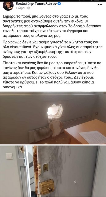 Ο κ. Τσακαλώτος αναφέρει στην ανάρτησή του: «Σήμερα το πρωί, μπαίνοντας στο γραφείο με τους συνεργάτες μου αντικρίσαμε αυτήν την εικόνα. Οι διαρρήκτες αφού σκαρφάλωσαν στον 7ο όροφο, έσπασαν τον εξωτερικό τοίχο, ανακάτεψαν τα έγγραφα και αφαίρεσαν τους υπολογιστές μας.