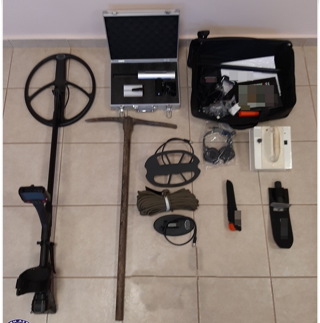Ειδικότερα, μετά από διενέργεια αστυνομικού ελέγχου, σε δύο Ι.Χ. αυτοκίνητα, στα οποία επέβαιναν οι συλληφθέντες, βρέθηκαν και κατασχέθηκαν δύο ανιχνευτές μετάλλων, καθώς και ένα σκαπτικό εργαλείο.