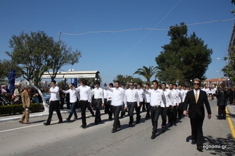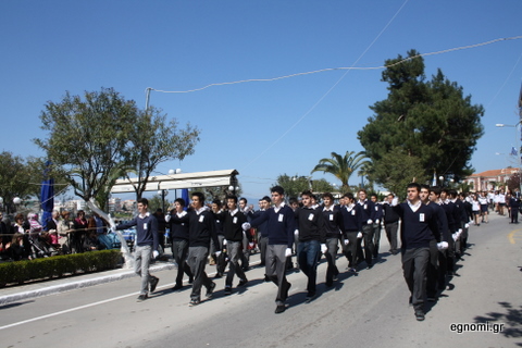Ανάποδα σε σχέση με όλα τα υπόλοιπα σχολεία παρέλασε το 4ο Γυμνάσιο (φωτό κάτω). Πρώτα παρέλασαν τα αγόρια και μετά τα κορίτσια.