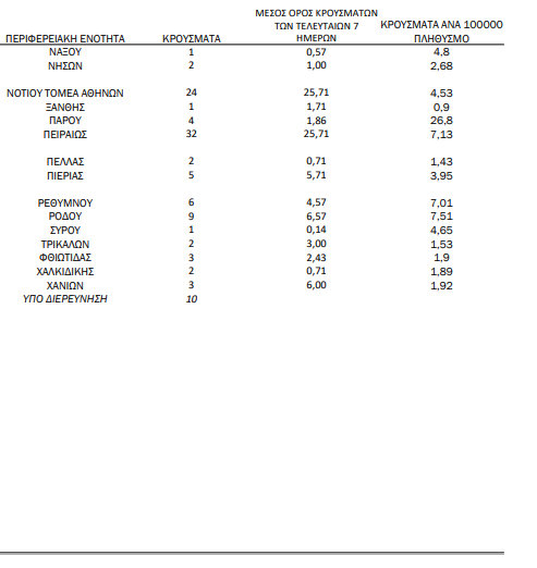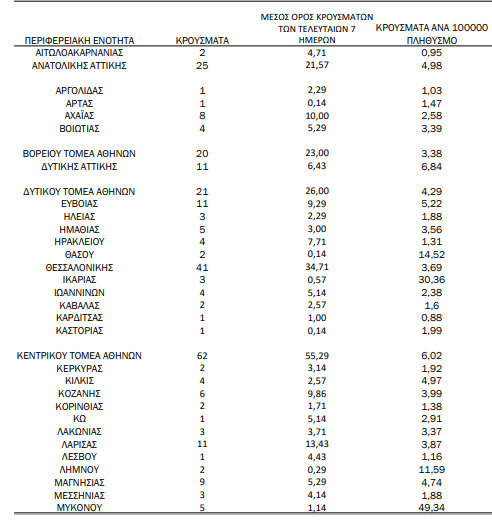 Η κατανομή των κρουσμάτων στο πανελλήνιο έχει ως εξής: