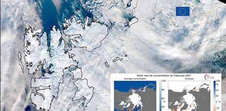Οι εικόνες χωρίς σύννεφα είναι σπάνιες το χειμώνα σε αυτήν την περιοχή, όμως ακόμα πιο σπάνια είναι η απουσία ύπαρξης πάγου στην συγκεκριμένη περιοχή. Ως ένθετο περιλαμβάνεται ο χάρτης που παράγεται από την Υπηρεσία Κλιματικής Αλλαγής του Κοπέρνικου που απεικονίζει την απουσία θαλάσσιου πάγου του Αρκτικού Ωκεανού τον Φεβρουάριο του 2021.