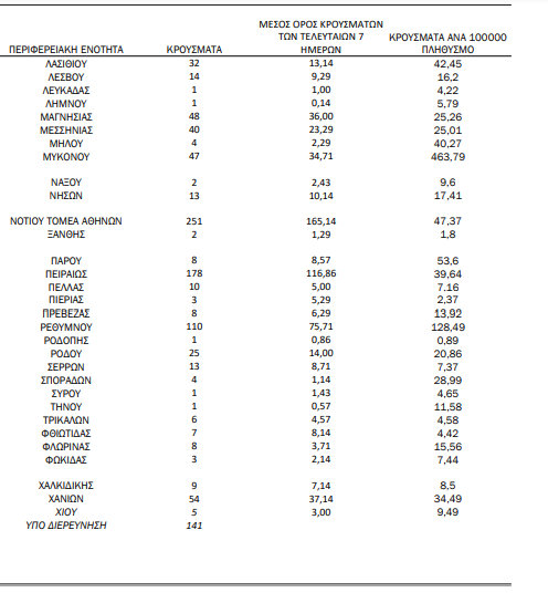 Στα… κόκκινα όμως παραμένει και η Κρήτη με 323 συνολικά κρούσματα. Συγκεκριμένα, εντοπίστηκαν 127 στο Ηράκλειο, 110 στο Ρέθυμνο, 54 στα Χανιά και 32 στο Λασίθι.