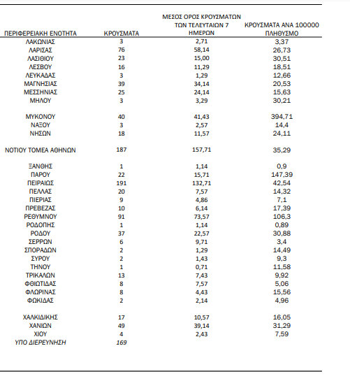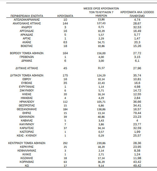 Αναλυτικά η διασπορά των κρουσμάτων στο πανελλήνιο φαίνεται στους παρακάτω πίνακες: