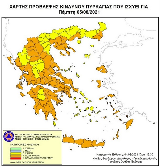Σύμφωνα με το Χάρτη Πρόβλεψης Κινδύνου Πυρκαγιάς, που εκδίδει η Γενική Γραμματεία Πολιτικής Προστασίας, για την Πέμπτη 5 Αυγούστου προβλέπεται πολύ υψηλός κίνδυνος πυρκαγιάς, με κατηγορία κινδύνου 4 σε πολλές περιοχές, μεταξύ των οποίων και η Εύβοια.