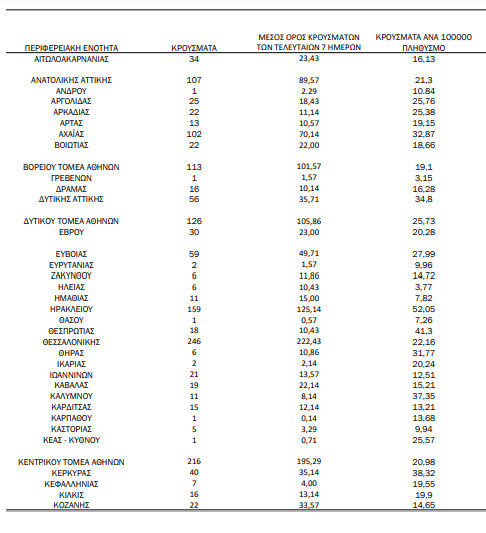 Η κατανομή των κρουσμάτων, ανά περιοχή, σε όλη την Ελλάδα, φαίνεται στους παρακάτω πίνακες: