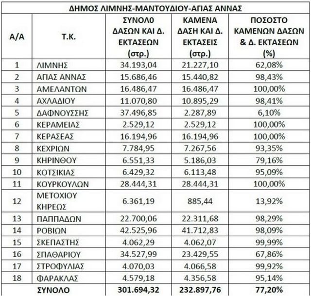 Είναι χαρακτηριστικό ότι στις περισσότερες Τ.Κ. το ποσοστό αυτό ξεπερνάει το 90% και φτάνει έως και το 100% των δασών και δασικών εκτάσεων που υπήρχαν.