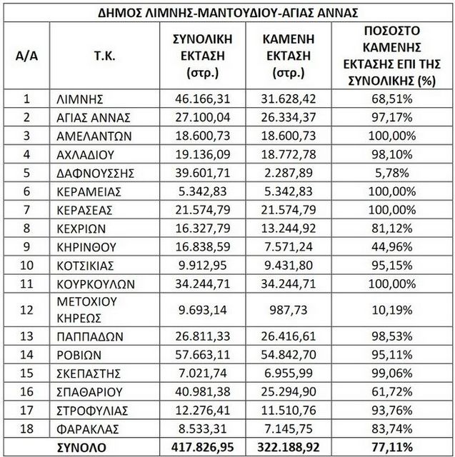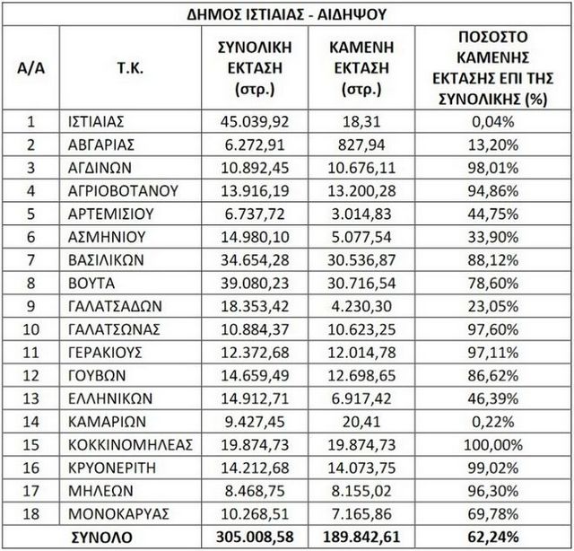 Στον πίνακα που ακολουθεί παρουσιάζονται οι Τοπικές Κοινότητες ανά Δήμο και η έκταση που έχει καεί.