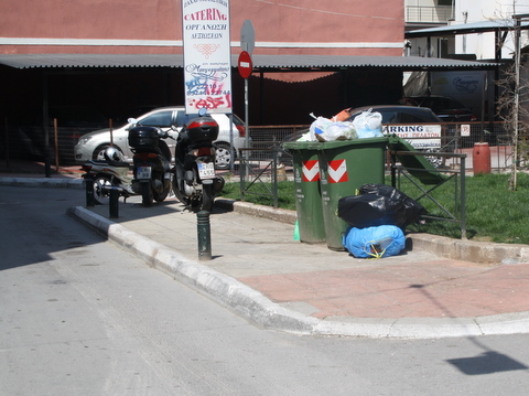 Γεγονός είναι ότι υπάρχει πρόβλημα. Για παράδειγμα η κυρία Λίτσα Βενιζέλου (φωτό αριστερά) μας έκανε παράπονα για τον κάδο στη συμβολή των οδών Βώκου και Δημητρίου (φωτό πάνω δεξιά), το πρωί της Δευτέρας 4 Απριλίου.