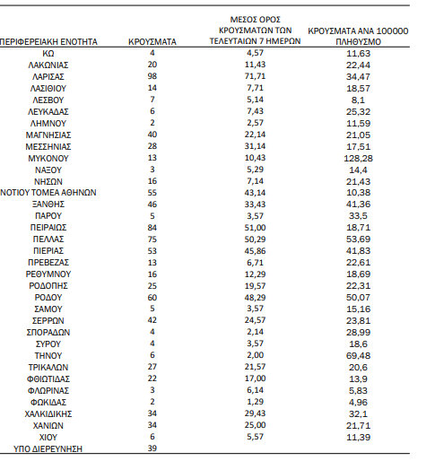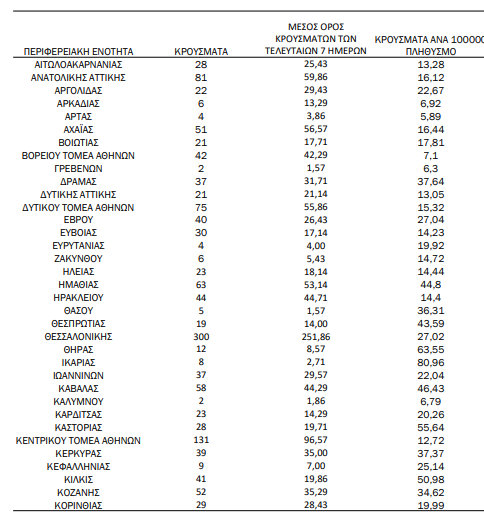 Στους πίνακες που ακολουθούν θα δείτε αναλυτκά τη διασπορά των κρουσμάτων σε όλη την Ελλάδα: