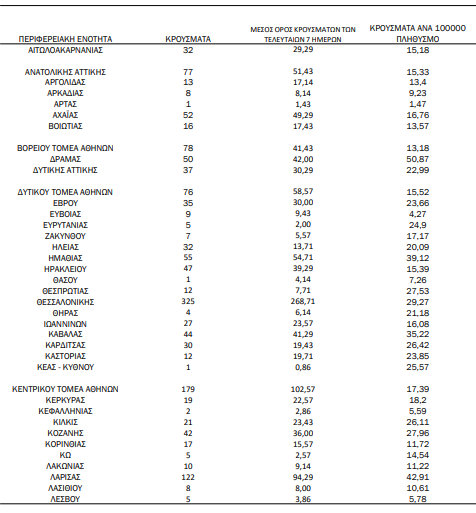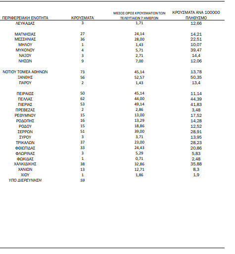 Στους δύο πίνακες, που ακολουθούν, μπορείτε να δείτε αναλυτικά την διασπορά των κρουσμάτων σε όλες τις περιοχές της Ελλάδας: