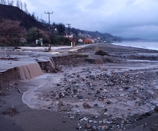 Τεράστια είναι η ζημιά στην παραλία Αχλαδίου, όπου το ρέμα γιγαντώθηκε και κατέστρεψε τον παραλιακό δρόμο (φωτό), την παιδική χαρά, κολόνες της ΔΕΗ και άλλες υποδομές.