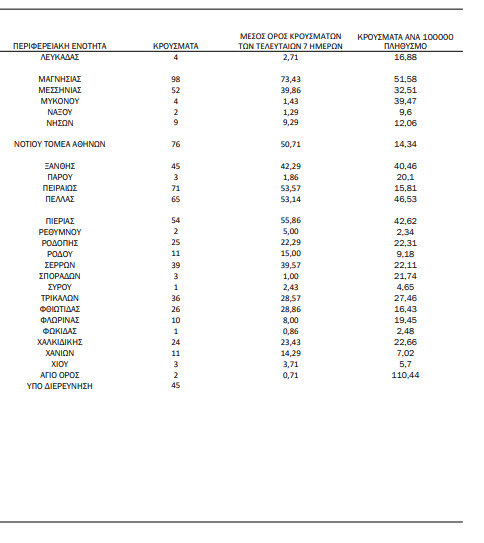 Στη Στερεά Ελλάδα εντοπίστηκαν συνολικά 77 κρούσματα, με δύο νομούς, την Βοιωτία και την Φθιώτιδα να μοιράζονται την πρωτιά με 26 κρούσματα. Η Εύβοια βρίσκεται στην τρίτη θέση με 21 κρούσματα, ακριβώς τα μισά σε σχέση με χθες, που ήταν 42.