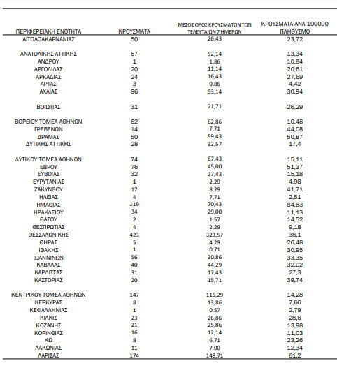 Η γεωγραφική διασπορά των κρουσμάτων σε όλη την Ελλάδα φαίνεται στους παρακάτω πίνακες:
