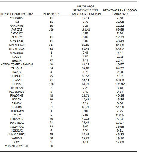 Αναλυτικά η γεωγραφική κατανομή των κρουσμάτων στο πανελλήνιο είναι η εξής: