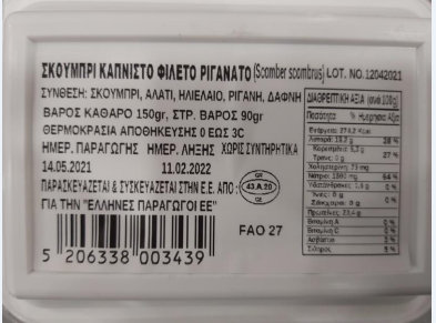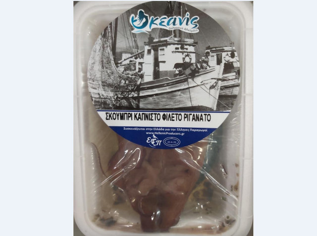 "Ο Ε.Φ.Ε.Τ. και ειδικότερα η Περιφερειακή Διεύθυνση Κεντρικής Μακεδονίας, κατά τη διενέργεια ελέγχων στο πλαίσιο του επίσημου ελέγχου έτους 2021 για τους πολυκυκλικούς αρωματικούς υδρογονάνθρακες, προέβη σε δειγματοληψία καπνιστού αλιεύματος με τα παρακάτω στοιχεία: «ΣΚΟΥΜΠΡΙ ΚΑΠΝΙΣΤΟ ΦΙΛΕΤΟ ΡΙΓΑΝΑΤΟ», σε συσκευασία καθαρού βάρους 150γρ., αριθμού παρτίδας Lot. No 12042021, με ημερομηνία παραγωγής 14-05-2021 και ημερομηνία λήξης 11-02-2022, που παράγεται και συσκευάζεται για λογαριασμό της εταιρείας «ΕΛΛΗΝΕΣ ΠΑΡΑΓΩΓΟΙ ΕΕ».