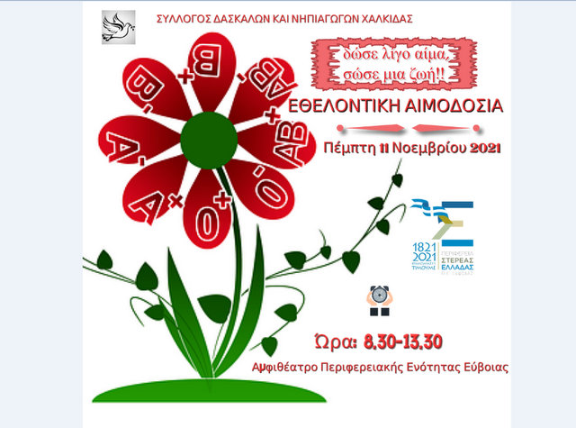 Ο Σύλλογος Δασκάλων - Νηπιαγωγών Χαλκίδας, σε συνεργασία με την Περιφερειακή Ενότητα Εύβοιας, πραγματοποιεί νέα εθελοντική αιμοδοσία προκειμένου να ενισχυθεί η τράπεζα αίματος του Συλλόγου.
