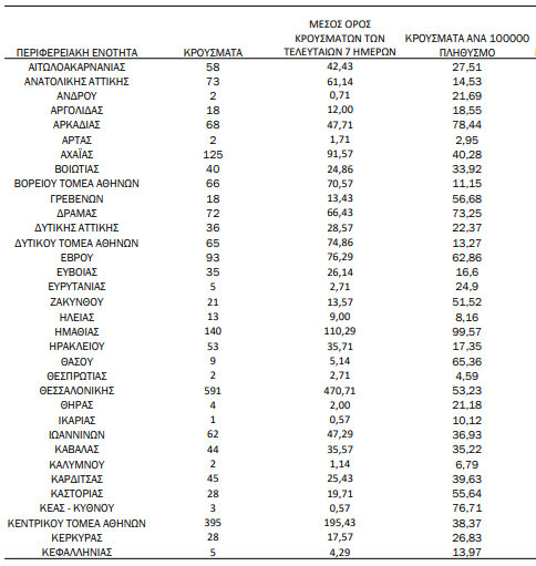 Στους δύο πίνακες κάτω μπορείτε να δείτε την γεωγραφική διασπορά των κρουσμάτων σε όλη την Ελλάδα: