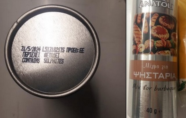 Συγκεκριμένα, ο ΕΦΕΤ και ειδικότερα η Περιφερειακή Διεύθυνση Κεντρικής Μακεδονίας, κατά τη διενέργεια ελέγχων προέβη σε δειγματοληψία τροφίμου με στοιχεία: «ΜΙΓΜΑ ΓΙΑ ΨΗΣΤΑΡΙΑ- MIX FOR BARBEQUE» με την επωνυμία ANATOLI , με ημερομηνία ανάλωσης κατά προτίμηση 31/5/2024 και αριθμό παρτίδας LOT 5131821TS προέλευσης Ε.Ε. σε μεταλλικό περιέκτη των 40 γραμμαρίων.