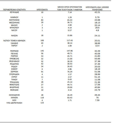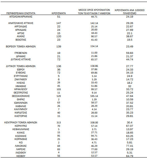 Η κατανομή των κρουσμάτων, ανά περιφερειακή ενότητα είναι σήμερα η εξής (σε παρένθεση τα χθεσινά νούμερα):