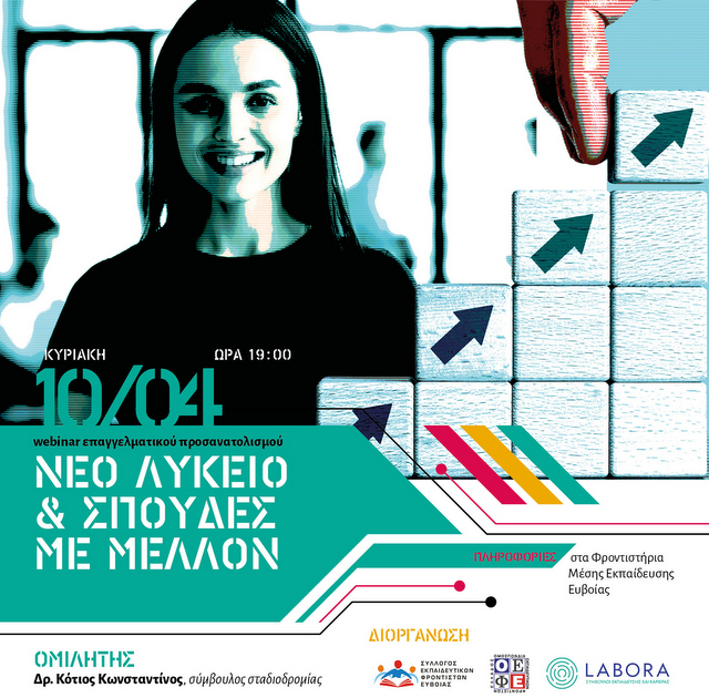 Την Κυριακή 10 Απριλίου, στις 7 το απόγευμα, θα πραγματοποιηθεί διαδικτυακή εκδήλωση ενημέρωσης μαθητών και των γονέων τους από το Σύλλογο Φροντιστών Ευβοίας. Εισηγητής θα είναι ο Δρ. Κωνσταντίνος Κότιος ,σύμβουλος σταδιοδρομίας.