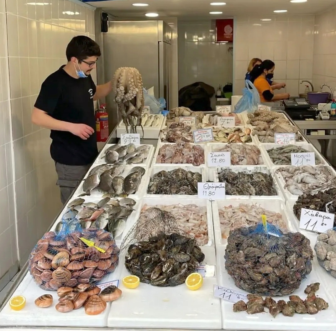 Στους πάγκους του θα βρείτε μεγάλη ποικιλία από όστρακα, μαλάκια και ψάρια, όλα φρέσκα ημέρας, κατευθείαν από το καΐκι της οικογένειας.