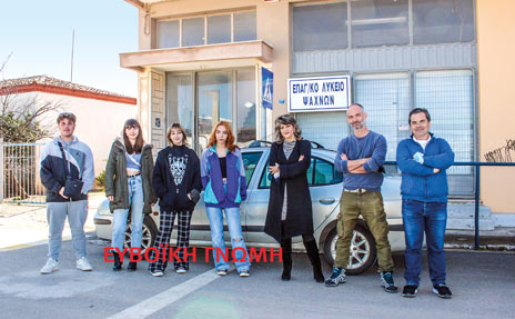 Οι μαθητές Κώστας Γκίκας, Ζωή Ντρένιου, Ραφαέλα Κυριαζή, Χριστίνα Ταυρή και Ζίλη Μπαλιάτσα με τους εκπαιδευτικούς Γιάννη Σέγκο και Κώστα Πετρόπουλο μπροστά στο ακατάλληλο κτήριο του ΕΠΑΛ Ψαχνών.