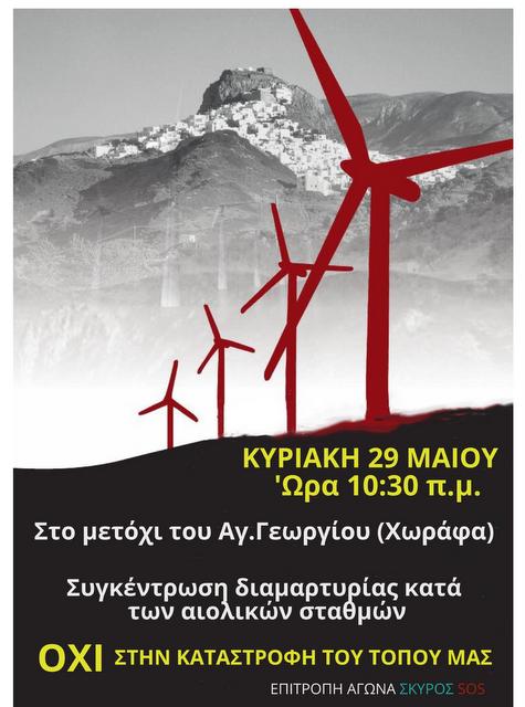 Η Επιτροπή Αγώνα κατοίκων της Σκύρου, την Κυριακή 29 Μαΐου, στις 10:30 το πρωί, στη θέση «Μετόχι» (Χωράφα), θα πραγματοποιηθεί συγκέντρωση διαμαρτυρίας κατά της εγκατάστασης ανεμογεννητριών στο νότιο τμήμα της Σκύρου.